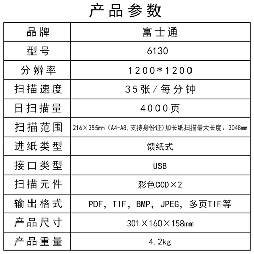 品牌: Fujitsu/富士通型号: 6130售后服务: 店铺三包接口类型: USB2.0光学分辨率(dpi): 1200x1200dpi最大幅面: A4颜色分类: fi6130(2) 富士通6230 富士通6130/6125 富士通6140z(2) 富士通7180 虹光AT360(600*1200dpi) fi-6130z 柯达i1210 fi6135zla(2) 柯达i1220扫描元件: CCD版本类型: 亚太扫描仪类型: 馈纸式扫描仪